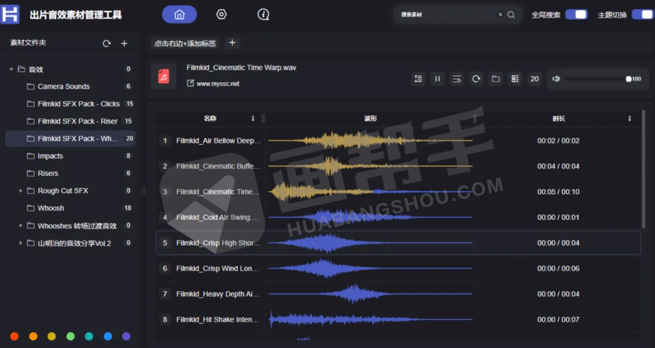 - 极速导入,一目了然:即使面对数十GB的海量音效库,也能快速完成扫描导入。右侧界面清晰展示每个音效的详细时长与直观波形图。