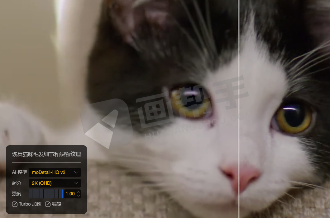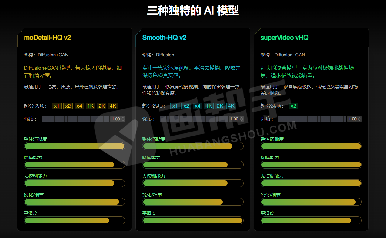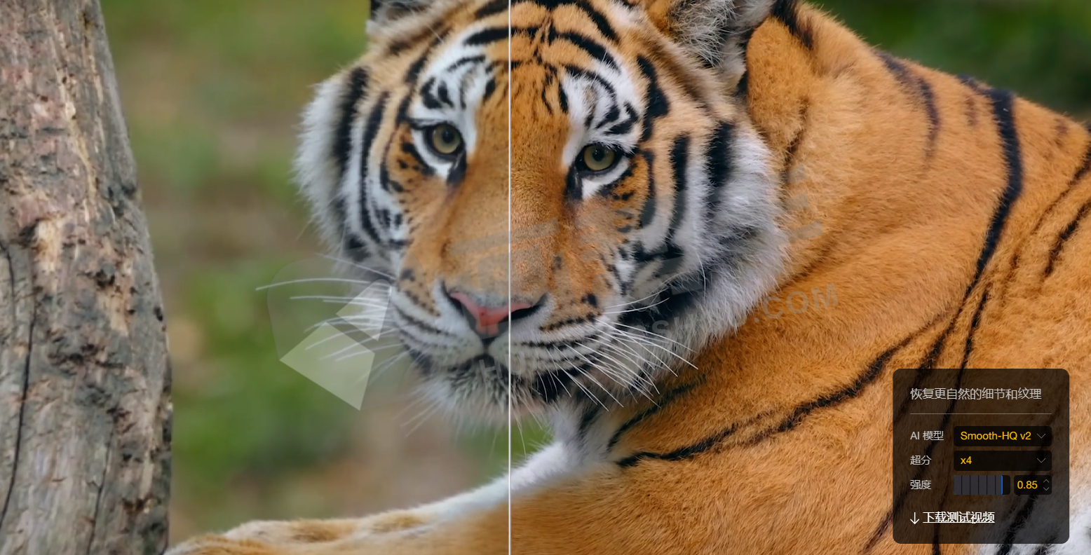 利用专有的视频和图像训练数据集,其定制 AI 模型在 GPU 优化速度下提供最佳画质,专门用于生成更多细节以提升视觉锐度、修复有瑕疵和降级的视频,或处理低光照等具挑战性的素材。