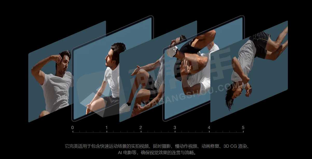 AI 插帧模块可轻松将卡顿视频提升至 90fps、120fps 或更高帧率,生成新帧以制作流畅的慢动作视频。基于 AI 训练的光流估计和运动补偿,生成的帧画面自然且连贯,可避免果冻效应、拖影或画面变形。