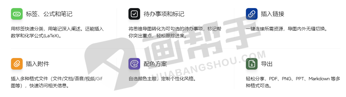 4. 共享和导出:XMind 可以导出多种格式,如 PDF、Word、PowerPoint、HTML、PNG、JPG 等,并支持导出到 MindManager、FreeMind 等其他思维导图软件。