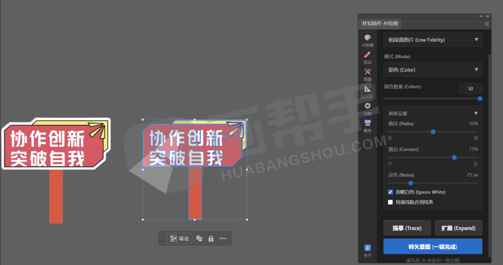 - 支持颜色分层、简化节点,比 Illustrator 自带“图像描摹”更智能