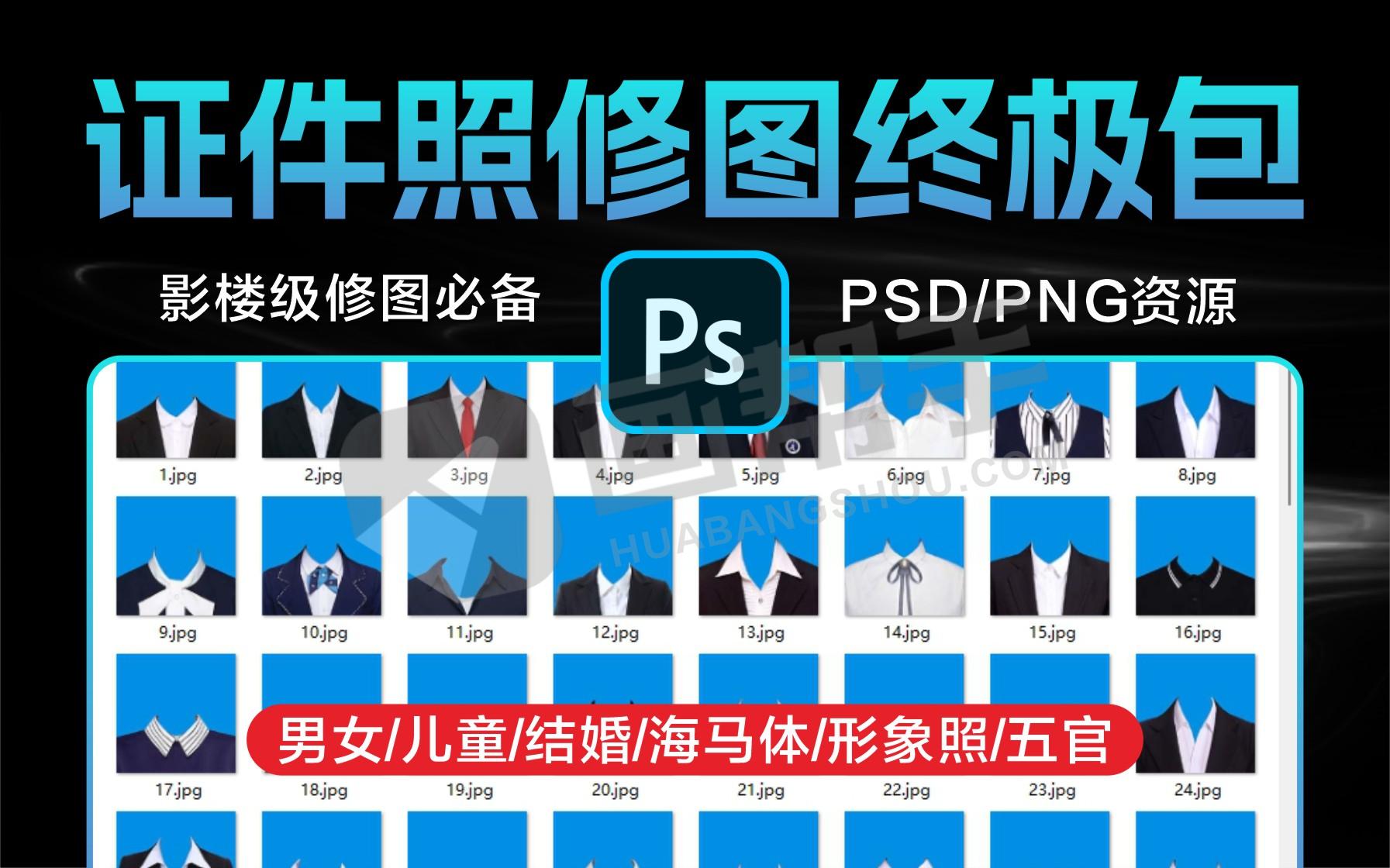 这套 “全网最全证件照素材合集” 汇集了解压后近40GB高质量PSD/PNG资源,专为影楼、修图师、美工及PS爱好者打造,一次性解决证件照全流程需求——从服装模板、妆容修饰到背景处理、五官精修,全部打包到位。