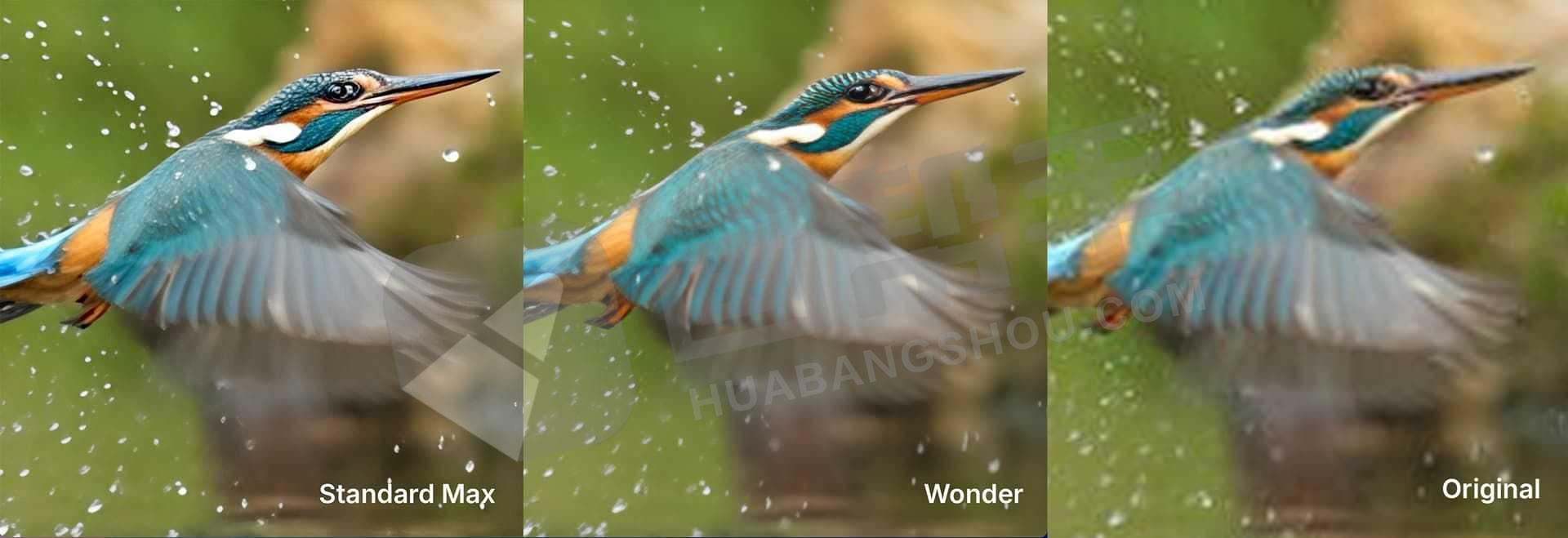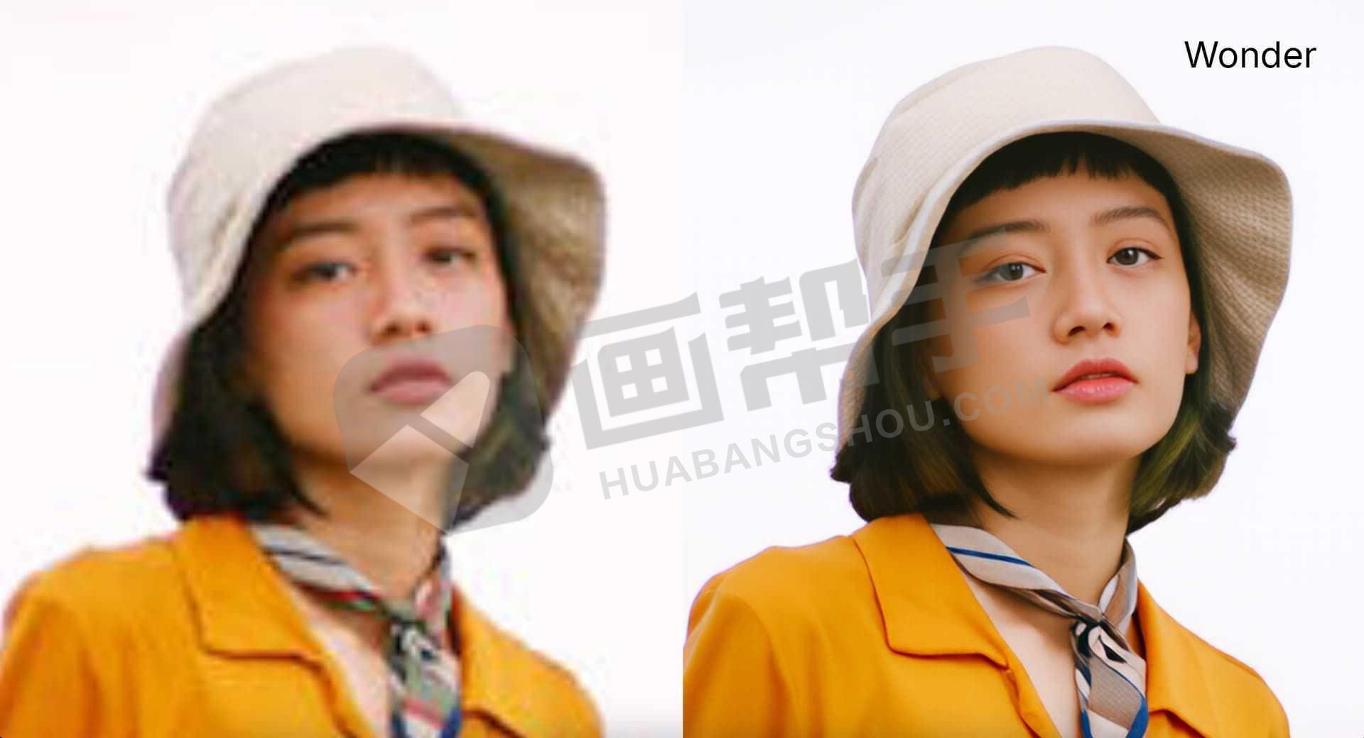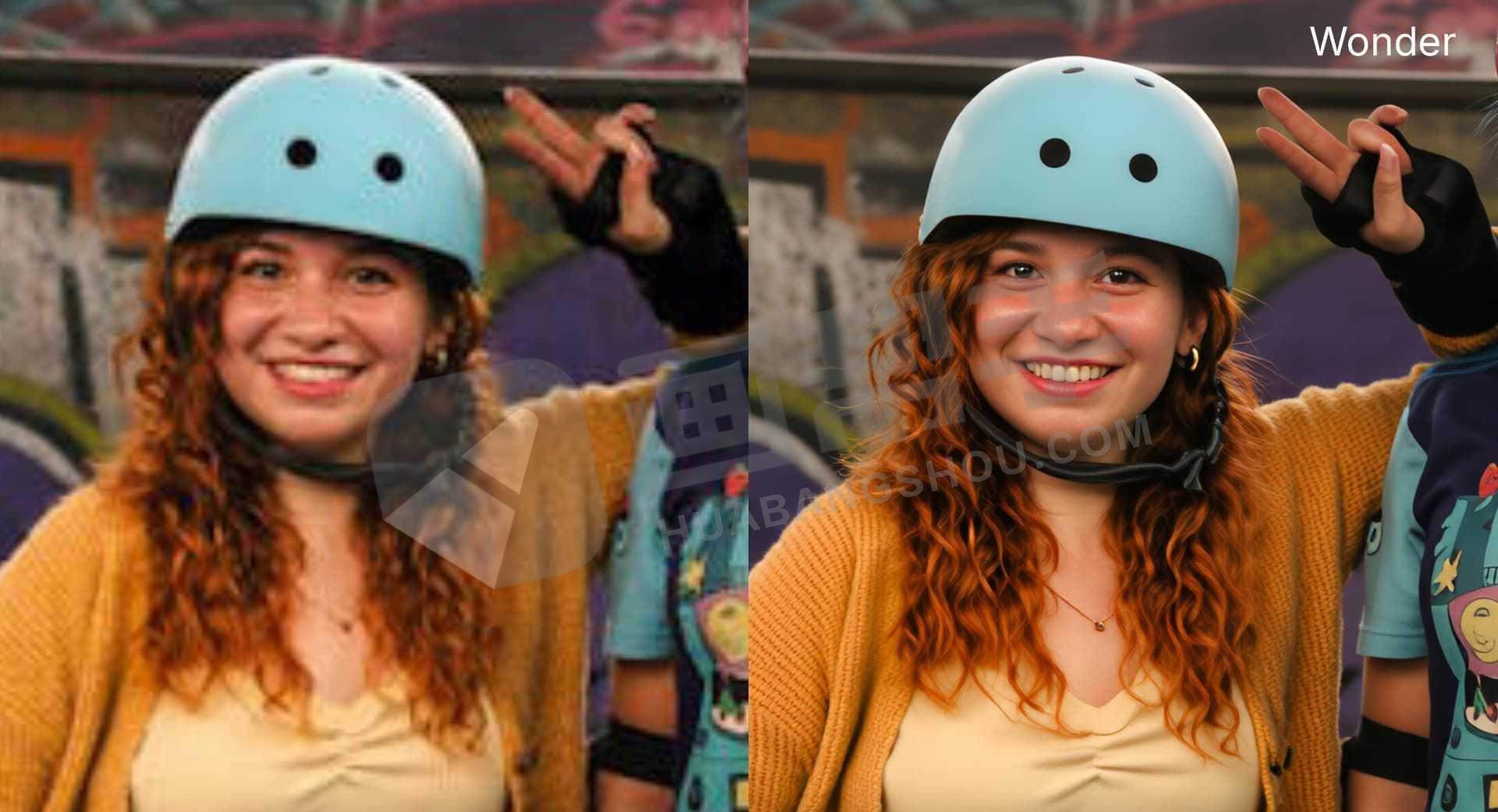 查看输出的微妙差异,Wonder 保持背景的完整性,并且不会在图像的右侧添加过度锐化的伪影。