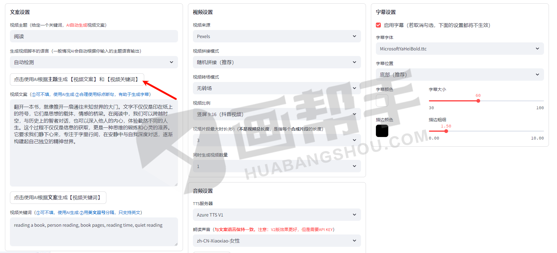 只需提供一个视频 主题 或 关键词 ,就可以全自动生成视频文案、视频素材、视频字幕、视频背景音乐,然后合成一个高清的短视频。